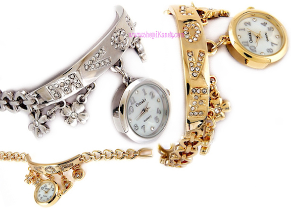 METAL BRACELET 7"Lx0.37"W / REAL WORKING WATCH CHARM: 1"DIA / LITTLE FLOWERS & HEART CHARMS