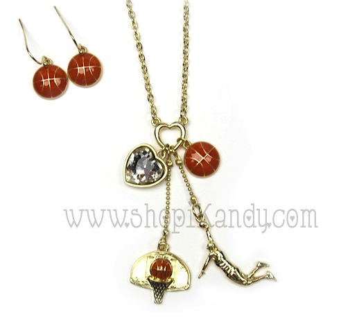 NECKLACE: 16"L +3"EXT/ 4 SPORTS CHARM BALLS: 1.5"EACH / SPORTS MOM CHARM: 2.25" / FISH HOOK EARRINGS: 1"DROP