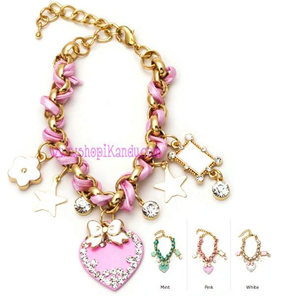 CORD CROSS BRACELET / TEAR DROP & OTHER CHARMS / CRYSTAL STUDS / 5"LONG / ADJUSTABLE